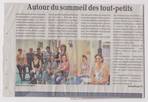 "Nous avons beaucoup apprécié les interventions de Magali (soirée échanges sur le thème du sommeil, intervention lors des ateliers sur les mobilisations douces), à la fois accessibles et intéressantes. Son approche est sensible, douche, dans un souci permanent de respect de chacun et de bineveillance pour tous. Le maître mot est la sécurité affective ou "réservoir affectif", maioon indispensable pour accompagner doucement l'enfant, en accord avec son rythme, vers l'autonomie. Marine, Adeline et Pascale, Relais assistantes maternelles du Val d'Adour, mars 2018"
